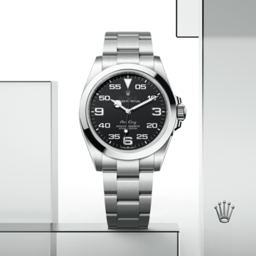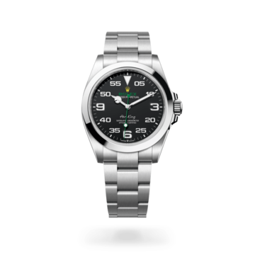 Die Air‑King besticht durch ein schwarzes Zifferblatt mit vergrößerten Ziffern bei 3, 6 und 9 Uhr und eine markante Minutenskala zum Ablesen der Navigationszeiten. Sie trägt den Schriftzug „Air‑King“, der in den 1950er-Jahren speziell für dieses Modell kreiert wurde.