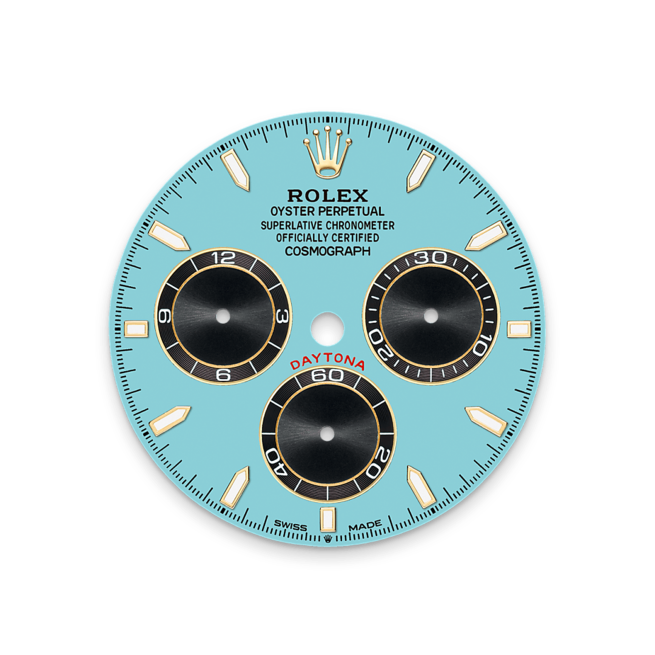 Dieses Modell verfügt über ein Zifferblatt in Türkisblau und Schwarz mit azurierten Zählern, applizierten Indizes in 18 Karat Gold und Zeigern mit Chromalight-Anzeige, einer lange nachleuchtenden Leuchtmasse. Das Zifferblatt lässt einen Rennfahrer seine Zeiten präzise messen und seine Fahrstrategie anpassen.