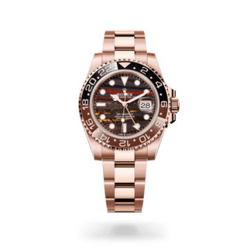 Diese GMT‑Master II besitzt ein Zifferblatt in Tigereisen. Dieses von Rolex bislang noch nie für diese Uhr verwendete metamorphe Gestein sticht durch seine reichhaltige Textur hervor. Der Stein, eine Mischung aus drei Mineralien – Tigerauge, roter Jaspis und silberner Hämatit –, wurde mit seinen goldenen und orangefarbenen Reflexen dank sorgfältiger Auswahl und Zusammenstellung harmonisch mit dem Farbton des Gehäuses und des Armbands in Einklang gebracht.