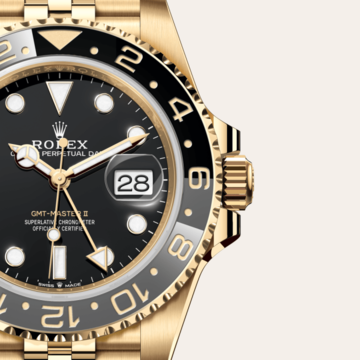 Dieses Modell verfügt über ein Zifferblatt in Schwarz und eine zweifarbige Cerachrom-Zahlenscheibe in grauer und schwarzer Keramik. In Ergänzung zu den traditionellen Stunden-, Minuten- und Sekundenzeigern besitzt die GMT‑Master II einen zusätzlichen Zeiger mit pfeilförmiger Spitze, der sich in 24 Stunden einmal um das Zifferblatt dreht, sowie eine in beide Richtungen drehbare Lünette mit 24-Stunden-Graduierung. Ein markant gefärbter 24-Stundenzeiger gibt die Referenzzeit an, die auf der Graduierung der Lünette abzulesen ist und die der Zeit in der ersten Zeitzone (zum Beispiel des Wohnorts) entspricht. Die Lokalzeit des Reisenden lässt sich in Einstundensprüngen leicht über einen raffinierten Mechanismus verstellen, der durch die Aufzugskrone zu bedienen ist. Der Stundenzeiger kann unabhängig vom Minuten- und Sekundenzeiger mit dem oder gegen den Uhrzeigersinn verstellt werden. Dies ermöglicht es den Reisenden, die neue Zeitzone einzustellen, ohne dass die Zeitangabe dabei an Präzision einbüßt.