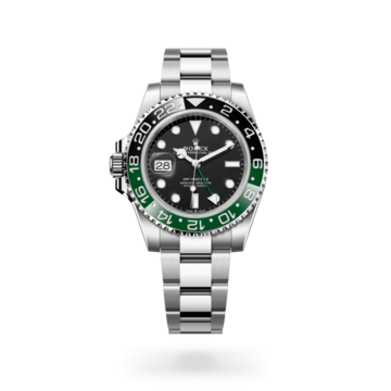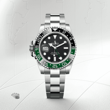 Dieses Modell verfügt über ein Zifferblatt in Schwarz und eine zweifarbige Cerachrom-Zahlenscheibe in grüner und schwarzer Keramik. In Ergänzung zu den traditionellen Stunden-, Minuten- und Sekundenzeigern besitzt die GMT‑Master II einen zusätzlichen Zeiger mit pfeilförmiger Spitze, der sich in 24 Stunden einmal um das Zifferblatt dreht, sowie eine in beide Richtungen drehbare Lünette mit 24-Stunden-Graduierung. Ein markant gefärbter 24-Stundenzeiger gibt die Referenzzeit an, die auf der Graduierung der Lünette abzulesen ist und die der Zeit in der ersten Zeitzone (zum Beispiel des Wohnorts) entspricht. Die Lokalzeit des Reisenden lässt sich in Einstundensprüngen leicht über einen raffinierten Mechanismus verstellen, der durch die Aufzugskrone zu bedienen ist. Der Stundenzeiger kann unabhängig vom Minuten- und Sekundenzeiger mit dem oder gegen den Uhrzeigersinn verstellt werden. Dies ermöglicht es den Reisenden, die neue Zeitzone einzustellen, ohne dass die Zeitangabe dabei an Präzision einbüßt. Die Cerachrom-Zahlenscheibe wiederum präsentiert sich in einer neuartigen Farbkombination von Schwarz und exklusivem Grün, die diesem Modell vorbehalten ist.