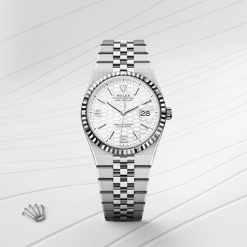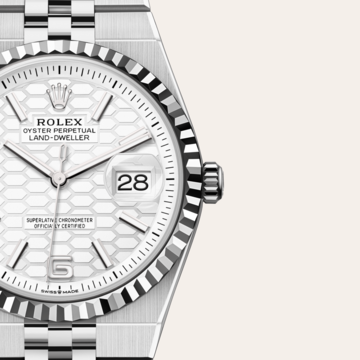 Die geriffelte Lünette von Rolex ist ein Markenzeichen. Ursprünglich hatte die Riffelung der Oyster Lünette einen praktischen Zweck: Sie diente zum Verschrauben mit dem Gehäuse, um die Wasserdichtheit der Armbanduhr zu gewährleisten. Die Riffelung entsprach deshalb der des Gehäusebodens, der ebenfalls mithilfe von Rolex Spezialwerkzeugen mit dem Gehäuse verschraubt wurde, um die Uhr wasserdicht zu machen. Mit der Zeit erhielt die Riffelung eine rein ästhetische Funktion und wurde zu einem prägenden Element des stilistischen Markenerbes von Rolex. Heute ist die geriffelte Lünette ein Distinktionsmerkmal, das bei dieser Land-Dweller 36 in Gold gefertigt wird.