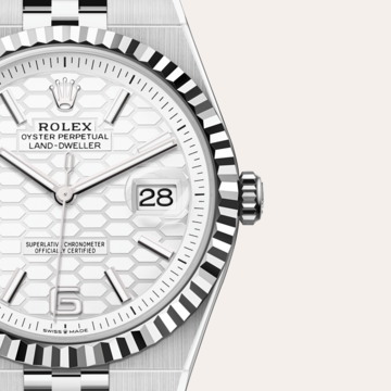 Die geriffelte Lünette von Rolex ist ein Markenzeichen. Ursprünglich hatte die Riffelung der Oyster Lünette einen praktischen Zweck: Sie diente zum Verschrauben mit dem Gehäuse, um die Wasserdichtheit der Armbanduhr zu gewährleisten. Die Riffelung entsprach deshalb der des Gehäusebodens, der ebenfalls mithilfe von Rolex Spezialwerkzeugen mit dem Gehäuse verschraubt wurde, um die Uhr wasserdicht zu machen. Mit der Zeit erhielt die Riffelung eine rein ästhetische Funktion und wurde zu einem prägenden Element des stilistischen Markenerbes von Rolex. Heute ist die geriffelte Lünette ein Distinktionsmerkmal, das bei dieser Land-Dweller 40 in Gold gefertigt wird.