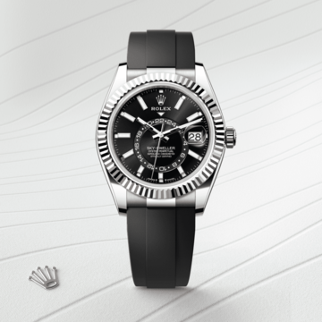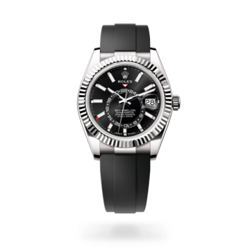 Das neue patentierte und von Rolex entwickelte Oysterflex-Band der Sky‑Dweller bietet eine sportliche Alternative zum Metallarmband. Das Band ist mit dem Gehäuse und der Oysterclasp-Schließe durch ein flexibles Metallfederblatt aus einer Nickel-Titan-Legierung verbunden. Das Federblatt ist mit hochwertigem, schwarzem Elastomer überzogen, das besonders wenig anfällig für Umwelteinflüsse, außerordentlich langlebig und absolut verträglich für den Träger ist. Zur Erhöhung des Tragekomforts verfügt das Oysterflex-Band an den Innenseiten über patentierte seitliche „Polster“, die die Armbanduhr am Handgelenk stabilisieren. Es ist zudem mit einer Oysterclasp-Schließe aus 18 Karat Weißgold versehen. Ferner ist es mit dem patentierten und von der Uhrenmarke entwickelten Rolex Glidelock-Verlängerungssystem ausgestattet. Diese in die Schließe integrierte raffinierte Vorrichtung mit Zahnschiene erlaubt eine fein abgestufte Verlängerung des Armbands ohne Einsatz jeglicher Werkzeuge um bis zu circa 15 mm in Rastungen von circa 2,5 mm.