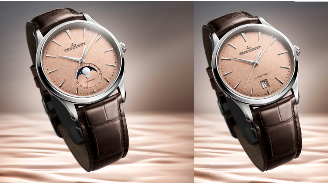 Jaeger-LeCoultre presents the Master Ultra Thin Date and the Master Ultra Thin Moon with new, grained dials in a soft, copper-colored hue. The subtle texture and warm color of the dials contrast with the cool gleam of the polished stainless steel cases, lending a fresh interpretation to the timeless aesthetic and masterful engineering for which the Master Ultra Thin collection is renowned.