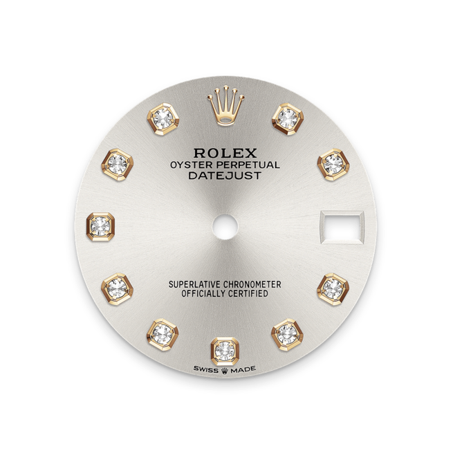 This dial features diamonds in 18 ct gold settings. The sunray finish creates delicate light reflections on many dials in the Oyster Perpetual collection. It is obtained using masterful brushing techniques that create grooves running outwards from the centre of the dial. Light is diffused consistently along each engraving, creating a characteristic subtle glow that moves depending on the position of the wrist. Once the sunray finish has been completed, the dial colour is applied using Physical Vapour Deposition or electroplating. A light coat of varnish gives the dial its final look.