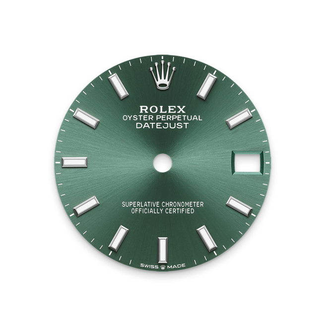 The sunray finish creates delicate light reflections on many dials in the Oyster Perpetual collection. It is obtained using masterful brushing techniques that create grooves running outwards from the centre of the dial. Light is diffused consistently along each engraving, creating a characteristic subtle glow that moves depending on the position of the wrist. Once the sunray finish has been completed, the dial colour is applied using Physical Vapour Deposition or electroplating. A light coat of varnish gives the dial its final look.