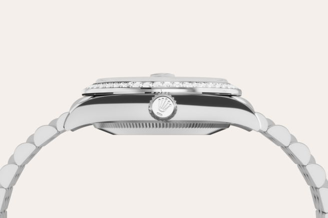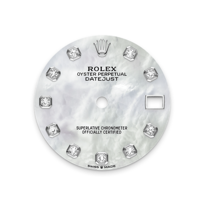 This dial features diamonds in 18 ct gold settings. Mother-of-pearl is by its nature full of mystery and surprises. Depending on its origin, it can be pink, white, black or yellow. It differs in colour, intensity and structure according to the part of the shell from which it is extracted. At Rolex, mother-of-pearl is never artificially coloured. Instead, particular know-how and skill are devoted to simply highlighting its natural beauty and preserving the original hues. As all mother-of-pearl dials are unique pieces, an identical dial will never be found on another wrist.