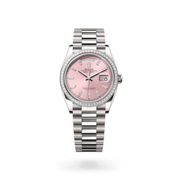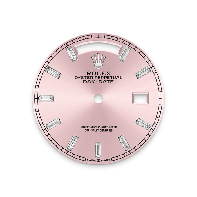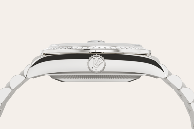 This dial features 10 baguette-cut diamonds. The sunray finish creates delicate light reflections on many dials in the Oyster Perpetual collection. It is obtained using masterful brushing techniques that create grooves running outwards from the centre of the dial. Light is diffused consistently along each engraving, creating a characteristic subtle glow that moves depending on the position of the wrist. Once the sunray finish has been completed, the dial colour is applied using Physical Vapour Deposition or electroplating. A light coat of varnish gives the dial its final look.