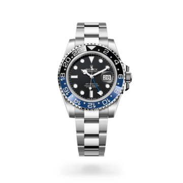 This model features a black dial and a two-colour Cerachrom bezel insert in blue and black ceramic. In addition to conventional hour, minute and seconds hands, the GMT-Master II features an arrow-tipped hand, which circles the dial once every 24 hours, as well as a bidirectional rotatable 24-hour graduated bezel. The distinctively coloured 24-hour hand displays the “home” reference time in a first time zone which can be read on the graduations on the bezel. The traveller’s local time is easily set by “jumping” from hour to hour, thanks to an ingenious mechanism operated via the winding crown: the hour hand can be adjusted forwards or backwards independently of the minute and seconds hands. This allows travellers to adapt to their new time zone without affecting the precision of their timekeeping.