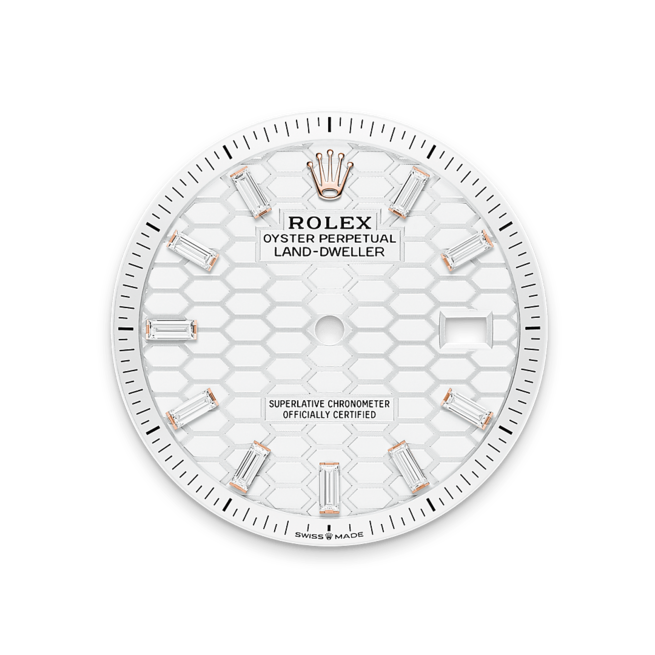 This dial is adorned with a honeycomb motif with a satin finish. Its creation calls on traditional craftsmanship and high-technology methods, all mastered in-house. The honeycomb structure is cut with a femtosecond laser, which is also used to etch the delicate lines in the grooves separating each cell. The dial is set with 10 baguette-cut diamonds to mark the hours.