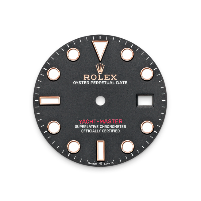 The Yacht-Master’s bidirectional rotatable 60-minute graduated bezel is made entirely from precious metals or fitted with a Cerachrom insert in high-tech ceramic. The raised polished numerals and graduations stand out clearly against a matt, sand-blasted background. This functional bezel – which allows the wearer to calculate, for example, the sailing time between two buoys – is also a key component in the model’s distinctive visual identity.