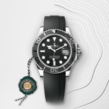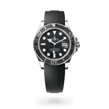 The Yacht-Master’s new Oysterflex bracelet, developed by Rolex and patented, offers a sporty alternative to metal bracelets. The bracelet attaches to the watch case and the Oysterlock safety clasp by a flexible titanium and nickel alloy metal blade. The blade is overmoulded with high-performance black elastomer which is particularly resistant to environmental effects, very durable and perfectly inert for the wearer of the watch. For enhanced comfort, the inside of the Oysterflex bracelet is equipped with a patented longitudinal cushion system that stabilizes the watch on the wrist and fitted with an 18 ct white gold Oysterlock safety clasp. It also features the Rolex Glidelock extension system, designed by the brand and patented. This inventive toothed mechanism, integrated beneath the clasp, allows fine adjustment of the bracelet length by some 15 mm in increments of approximately 2.5 mm, without the use of tools.